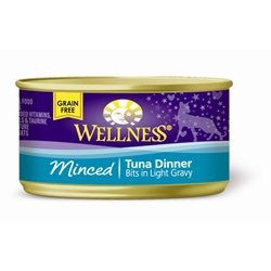 Wellness Grain-Free Minced Tuna Dinner Canned Cat Food is a grain-free recipe of tasty, minced tuna bits (single protein source), fresh fruits and vegetables, along with added vitamins, minerals and taurine in a a rich gravy for complete and balanced adult maintenance. Only healthy ingredients are included - no meat by-products, rendered animal fats, artificial flavors, colors or preservatives. It is a great way to add some variety to your cataTMs diet, in addition to providing an additional source of water for healthy hydration!