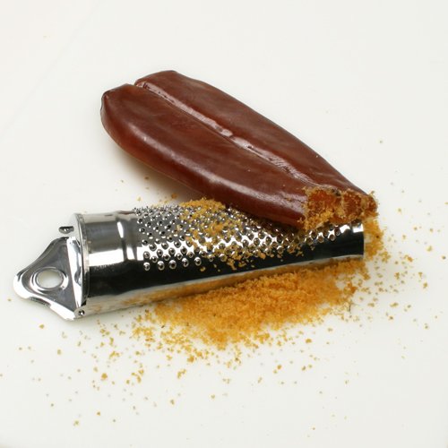 Bottarga di Muggine is salted, pressed, and dried grey mullet roe. The ancient tradition of producing Bottarga has been maintained by devoted Sardinian fishermen. Bottarga is wonderful grated over green salad or pasta, or thinly shaved on crostini with an olive tapenade, accented with a curl of butter or a drizzle of extra virgin olive oil. Bottarga needs to be stored in the refrigerator. For long-term storage, do as Mario Batali does and wrap it in foil and keep in the freezer. Then, just grate off the lobe whenever you need to add some flavor to special dishes.